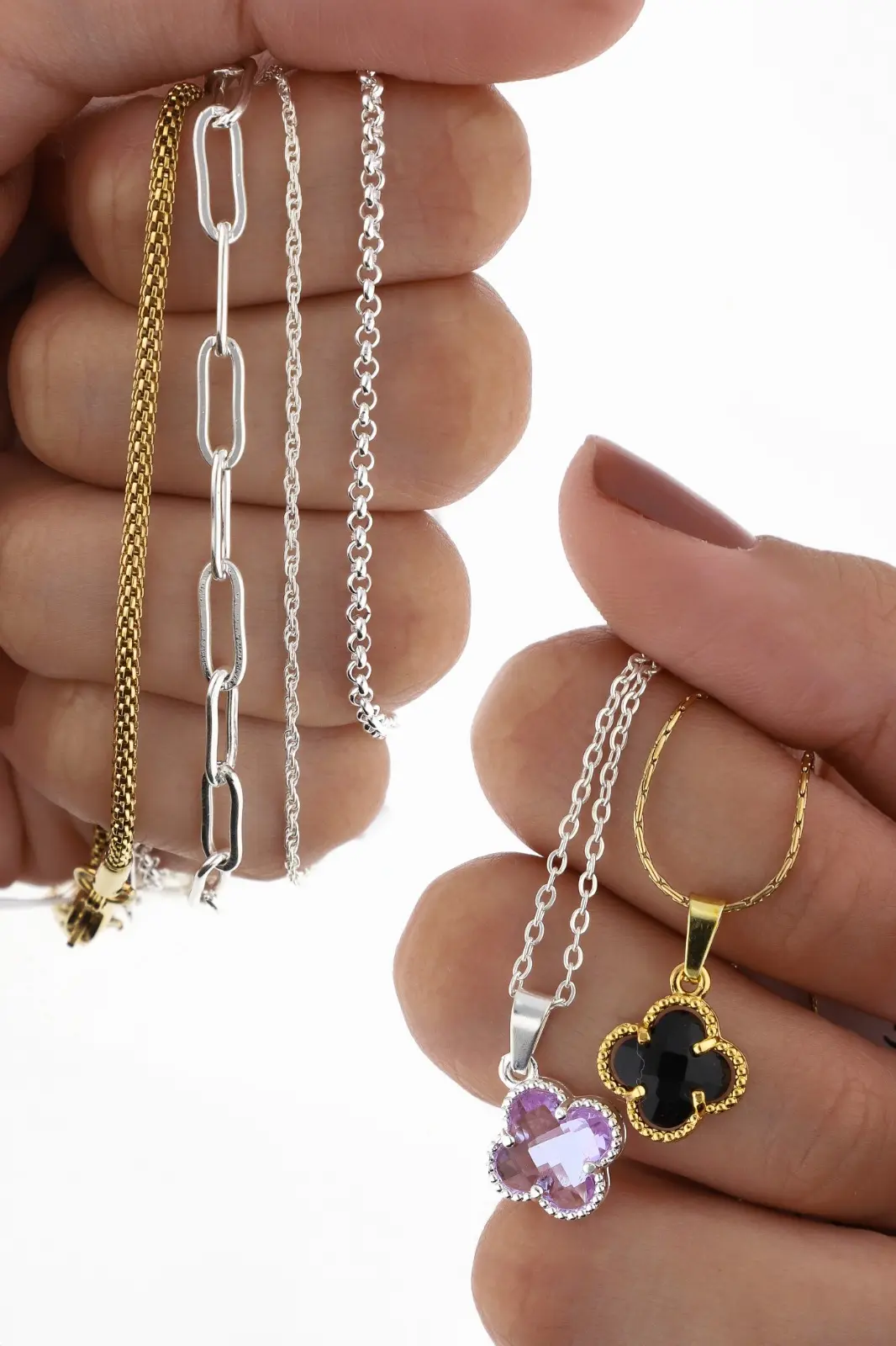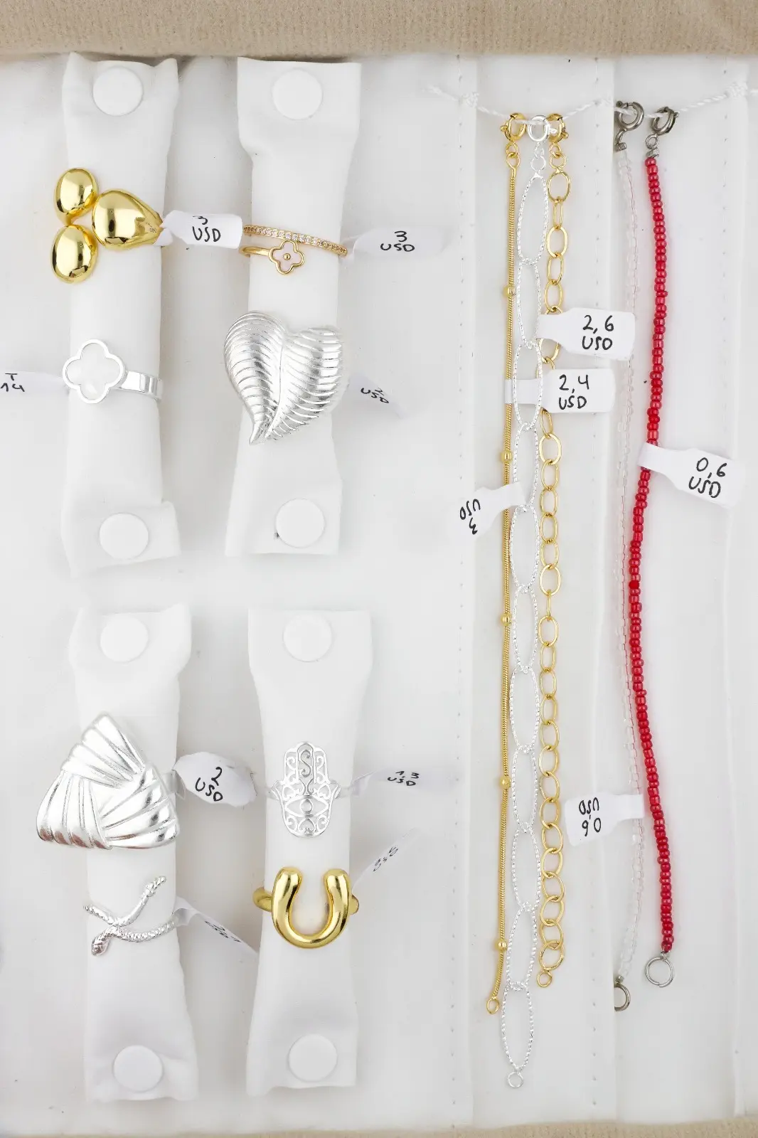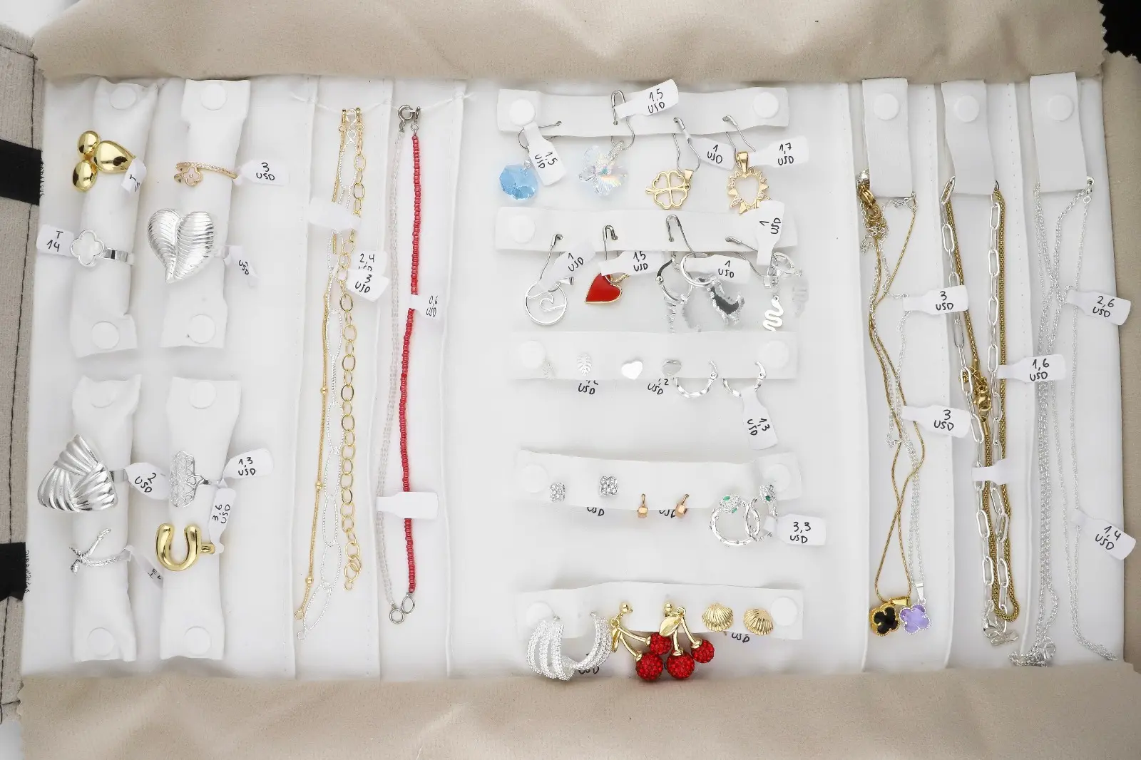 Incluye paño porta joyas, anillos, dijes, pulseras, aros y cadenas.
