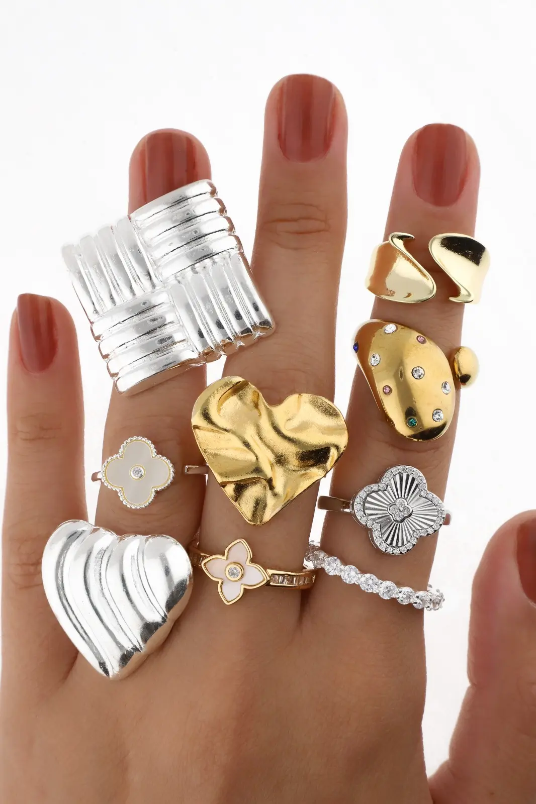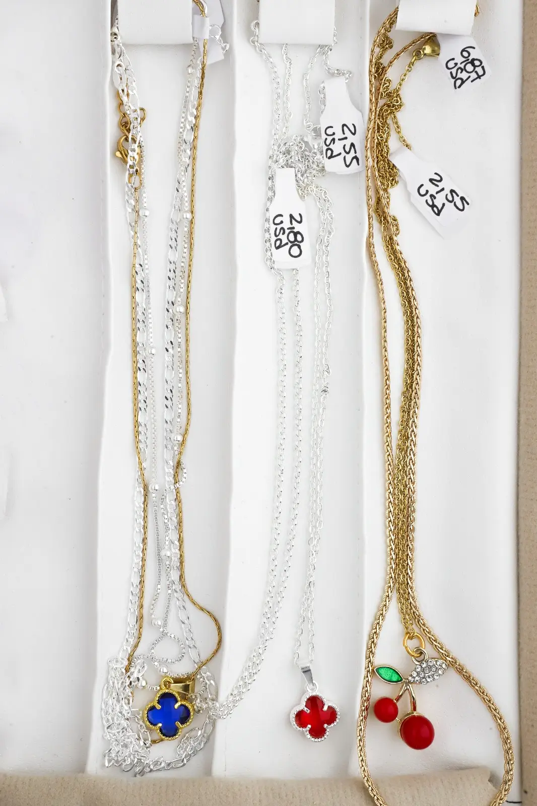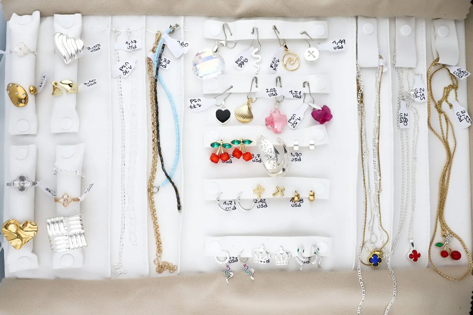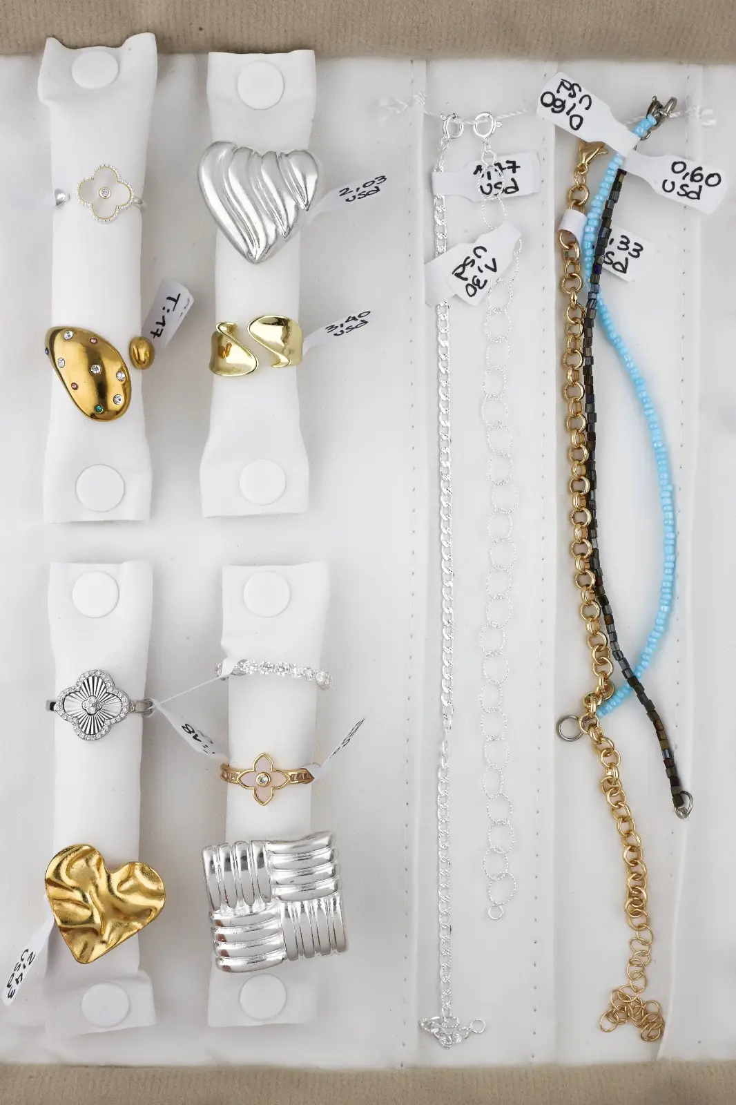 Incluye paño porta joyas, anillos, dijes, pulseras, aros y cadenas.